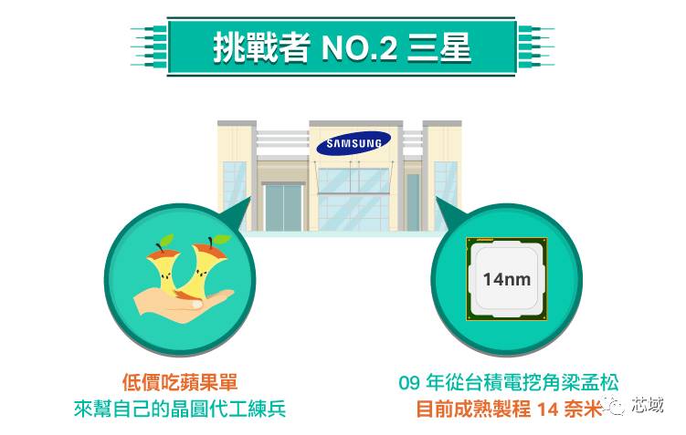 为了获得苹果的资源发展晶圆产业、同时不让自己的产能过剩(若处理器仅用在三星自身产品上会有多余产能),其晶圆代工几乎是用成本价吃掉苹果单、记忆体打包一起折扣卖,来帮自己的晶圆代工练兵。